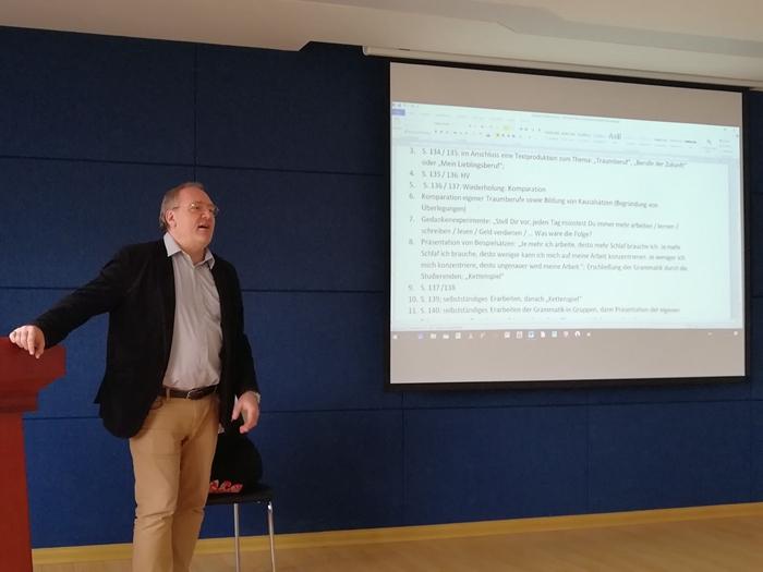 4日至7日,格里查先生就课堂组织的基本原理、课堂设计的基本模式、产出导向教学法、行动导向教学法、以及如何提高学生课堂参与度等为德语教师举行了为期4天的教学法讲座,并引导老师进行相关的课堂设计。