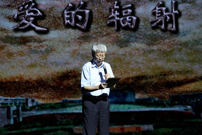 音乐剧开始之前,蔡敬民上台致辞。他说道:“《爱的辐射》通过艺术的形式再现了杨承宗先生的大爱和强国梦想,是一部爱国主义艺术作品。我们要大力弘扬社会主义核心价值观,不忘初心、牢记使命,坚持以人民的利益为最高利益,以报效国家为最高荣耀,把一切力量凝聚到为实现中华民族伟大复兴和中国梦而奋斗的宏伟蓝图上来。”