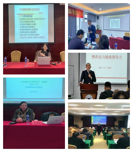 在培训过程中,浙江省教育厅副总督学、浙江省特级教师缪水娟,华东师范大学教育学部教育学系教授、博士生导师杜成宪,浙江大学继续教育心理学导师李育新,中国企业情商领导力系统导师张顾严,浙江师范大学法政学院教授宋高初分别作了题为《“十四五”基础教育改革的重点难点》、《中国传统的管理文化》、《教育智慧——管理心理学与教育管理赋能》、《博弈论与情商领导力》、《我国基础教育法规及案例分析》的专题报告。