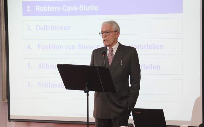 应我院邀请,12月7日上午,德国奥斯纳布吕克大学(Universität Osnabrück)汉斯-沃尔夫•奚伟德教授(Prof. Dr. Hans-Wolf Sievert)在学院一期六号楼学术报告厅为我院师生做了一场学术报告,主题是“跨文化交际中的刻板印象、偏见及防范”。报告由国际教育学院徐刚副院长主持,国际教育学院及外语系的德语教师及我院中德合作专业和德语专业的学生到场聆听。
