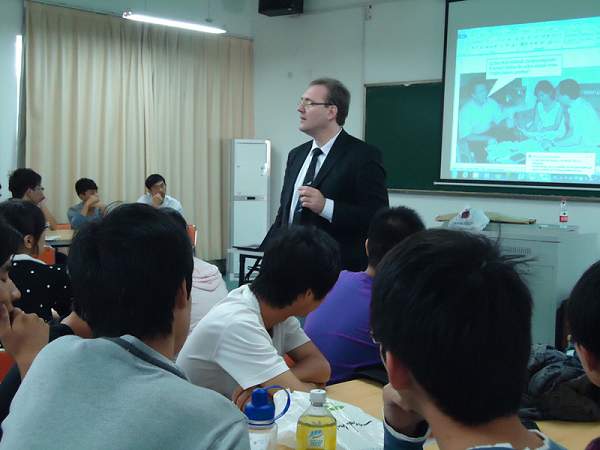 在管理系格里查先生以“跨文化交际”和“Test-DaF(德福)考试”为题为中德合作物流管理(LOGinCHINA)专业11级和12级的学生分别举行了专题报告。在谈到跨文化交际时,格里查先生介绍了中德文化差异,特别是中德两国教师授课方式的不同,鼓励同学们不仅要学好语言,更要从跨文化的角度尽快适应德国教师的授课,积极与教师沟通交流,以促进德语语言及专业课的学习。此外,格里查先生还向同学们介绍了Test-DaF(德福)考试的题型及应试技巧,以及如何在日常学习中有针对性地进行应试准备,争取尽快达到进入德国高校进行专业学习的语言水平。