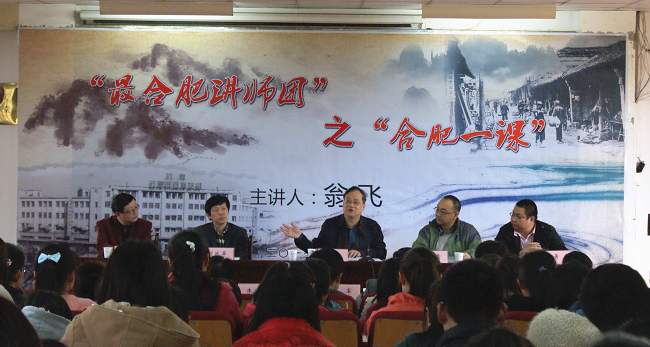 3月6日下午,由《合肥晚报》策划并推出的“最合肥讲师团” 首场报告会之“合肥一课”在合肥学院博学楼C座学术报告厅隆重举行。讲师团安徽省社科联历史文化中心主任翁飞,安徽省大别山研究院研究员鲍雷,著名作家、合肥方言研究者刘政屏,城市地理曁民风民俗独立研究人萧寒,“最合肥”周刊主笔、安徽省民俗学会副秘书长李云胜;合肥学院党委委员、纪委书记洪家友,《合肥晚报》总编辑陈军,副总编辑朱晓凯,文体中心主任王晖,副刊部主任石红彦,中文系主任詹向红,系副主任丁增武,系学术委员会主任朱育颖出席报告会。本场报告会由翁飞博士主讲。宣传部部长白义香主持报告会。我院120余名学生到场聆听。