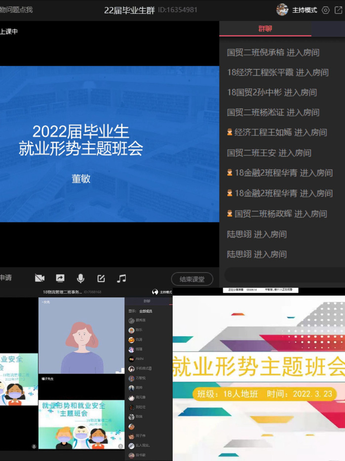 由于疫情原因,今年的就业形势主题班会采取线上线下相结合的方式开展。在主题班会上,毕业班辅导员深入剖析了疫情防控特殊时期的就业形势与动态,强调2022届全国普通高校毕业生规模、增量创历史新高,就业形势复杂严峻;精准解读目前各级政府出台的高校毕业生就业创业政策,内容全面具体,涉及基层就业、自主创业、权益保障等各类政策,帮助毕业生深刻理解国家对于高校毕业生就业创业的帮扶支持措施;针对部分毕业生中出现的就业难题与消极就业情绪等现象,辅导员一一予以解惑答疑,着重讲解了当前求职就业方式的转变及就业焦虑心理的应对方式;鼓励毕业生重视就业问题,主动解决问题,转变就业观念,做好自身定位,先就业、再择业,以积极的态度面对就业,做足就业准备;利用好学校的就业平台和机会,提升个人就业能力与素质,不断拓宽自身就业渠道,努力做到积极就业、尽早就业。
