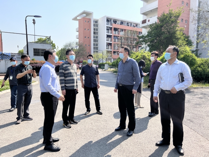 4月11日下午,经开区党工委委员、管委会副主任王家和来校督查疫情防控工作,校党委副书记刘建中和办公室、学生处、保卫处、公管处、后勤集团负责人陪同。