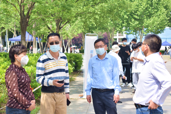 上午九点,校党委副书记刘建中前往各个检测点,看望慰问了核酸检测采集现场的医务工作者和相关工作人员,认真听取了各采样点有关负责人关于核酸检测进展、秩序维护等方面的介绍。