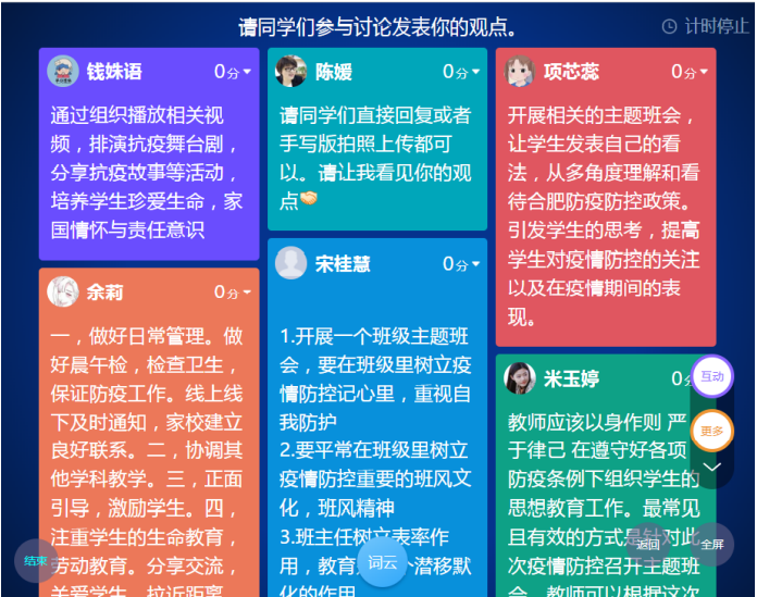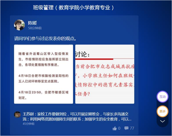 志不求易者成,事不避难者进。“尽管线上教学的难度大于线下教学,但一切困难都是可以克服的。”教育学院的陈媛老师说道。作为教育学院小学教育的专业负责人和专业课的任课教师,陈媛牢固树立责任意识和使命意识,忠实履行教书育人职责,积极探索疫情期间课程思政在线上教学的实践路径。本学期陈媛教授的课程为《班级管理》,在合肥疫情防控和学校抗“疫”过程中,学生们变成了亲历者和参与者,这些身边事成为陈老师线上教学最有意义的“导入案例”。她从合肥市疫情入手,带领同学们思考“在当前合肥市众志成城抗击疫情的背景下,小学班主任如何在班级管理中,运用疫情防控中的德育元素落实立德树人根本任务”。话题一经发布,这些未来的“青年教师们”在“云端”课堂里纷纷出谋划策,一时间掀起了一股讨论的热潮。从“学生”到“老师”,从“遵守者”到“管理者”,角色互换中,同学们深入体会到疫情防控工作的不易,真切感受到抗击疫情中所表现出的中国力量、中国精神和中国担当。