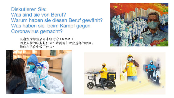 外国语学院的朱俊俏老师从细微处入手,着眼学生关注的话题,在《基础德语2》课上,基于学生一般都为零基础,在有限的课时学习中,能用于表达的内容相对偏少,朱老师联系实事,聚焦疫情下的职业选择,让同学们“有话可说”。通过“大白”、外卖小哥的图片以及“抗疫”、“奋战”等关键词,朱老师一步步带领学生了解不同职业的工作内容和职业行为,引导学生了解不同职业的道德要求。课堂上,朱老师对学生职业选择的理由进行提问,引导学生在今后进行职业选择时,把个人的未来自觉地融入国家和社会的需要之中。