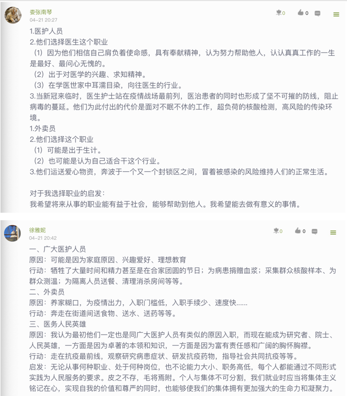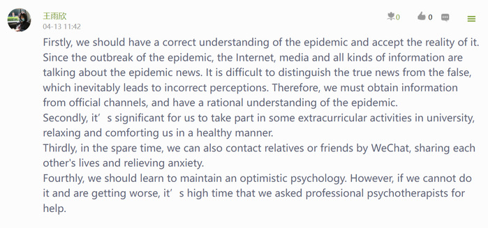对于课程思政,外国语学院的李静老师有着深刻的理解,“外语课程的思政教育是一个有深度有温度的潜移默化的教育过程,应该结合课程特点和学生的认知特点,贯彻课程思政隐性渗透原则”。最近几周,李老师发觉疫情让不少学生产生了焦虑和烦躁心理,致使学习自律性下降。为缓解学生的焦躁情绪,让更多学生在线上课堂“多抬头”“多开口”,李老师在《高级英语》课的线上教学中组织了一次课堂讨论:介绍一位你最敬佩的科学家。在讨论中,大部分同学都提到了钟南山和屠呦呦,李老师不仅扩充原有话题的内容与形式,还帮助同学了解防疫、抗疫的相关知识与政策。“这次讨论活动不仅帮助学生寻找疫情中的正能量,培养科学观和求真意识,还能激发学生树立远大理想,缓解焦躁情绪。”李老师说道。