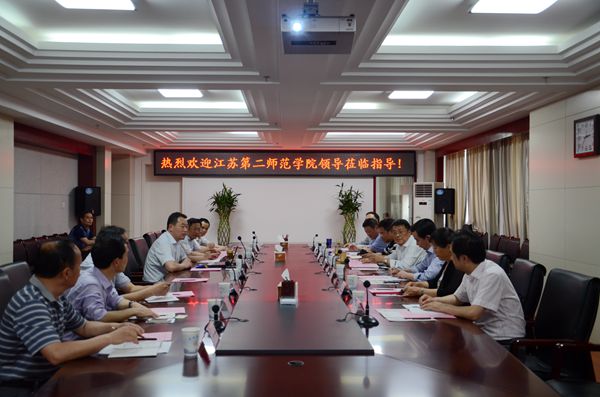5月26日,江苏第二师范学院常务副校长周成平、副校长王家军等一行7人来我校交流访问。我校校长张文兵在行政楼九楼东会议室热情接待了来宾,双方就“十三五”规划研制、大学章程研制等内容进行深入探讨。