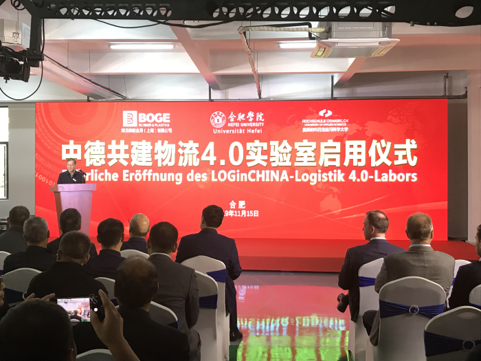 11月15日,中德共建物流4.0实验室落成暨启用仪式在我校产学研大楼顺利举行。合肥学院党委书记、校长王其东出席仪式,德国奥斯纳布吕克应用科学大学教授、中德合作物流管理专业项目负责人米歇尔•舒勒,安徽大学党委书记蔡敬民,海口经济学院校长陈啸,中国科学技术大学管理学院丁斌教授,博戈公司总经理福莱穆勒,德国人工智能研究所高级研究员亨利•歌思林博士等70余名专家及企业代表参加。本次仪式由合肥学院经济与管理学院院长陈江华主持。