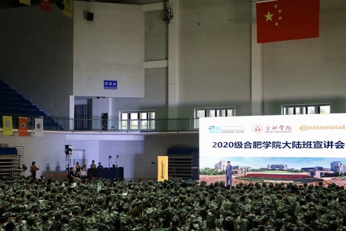 2020级大陆班招新宣讲会于9月22日在合肥学院体育馆正式举行。大陆马牌轮胎(中国)有限公司人力资源总监孙怡、大陆集团合肥工厂招聘经理刘乔松、大陆集团产品工业化部总监Kumar,我校国际交流合作处副处长张慧、先进制造工程学院院长吕刚、双元制大陆班专业负责人张光洲等人参加了本次活动。