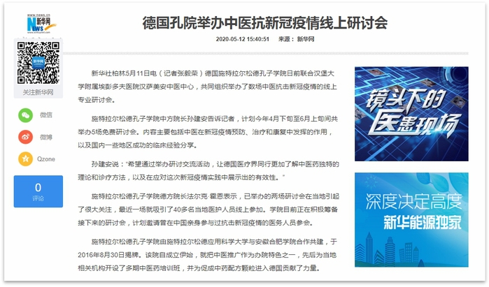 此次疫情同时在欧洲多国肆虐,目前德国医疗系统承受着巨大的压力,在进一步相对有效控制住本国疫情的同时,还接收了大量来自法国、意大利等邻国的重症患者。中医药及中西医结合诊疗在中国的成功经验,也获得了德国医疗专业人士的广泛关注。借此契机,合肥学院在德国施特拉尔松德共建的施特拉尔松德孔子学院联合德国汉堡大学附属埃彭多夫医院汉萨美安中医中心,共同组织举办了数场中医抗击新冠疫情的线上专业研讨会。按照计划,从4月下旬至6月上旬间共计举办5场免费研讨会,内容主要包括中医药在此次新冠疫情预防、治疗和康复中发挥的作用,以及中国国内一些地区成功的临床经验分享。施特拉尔松德孔子学院中方院长孙建安表示,希望通过举办研讨交流活动,让德国医疗界同行更加了解中医药独特的理论和诊疗方法,以及在应对这次新冠疫情实践中展示出的有效性。施特拉尔松德孔子学院德方院长法尔克·霍恩教授表示,已举办的两场研讨会在当地引起了很大关注,最近一场就吸引了40多名当地医护人员线上参加。学院目前正在积极筹备接下来的研讨会,计划邀请曾在中国亲身参与过抗击新冠疫情的医务人员参会。
