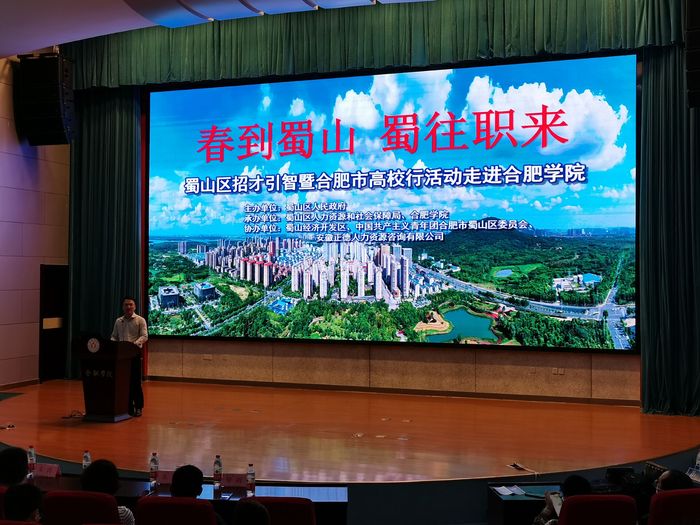 5月14日下午,由合肥市蜀山区人民政府主办,蜀山区人社局和合肥学院承办的“春到蜀山、蜀往职来”蜀山区招才引智暨合肥市高校行(合肥学院站)活动在我校图书馆学术报告厅A厅举行。合肥市大中专毕业生就业指导中心主任杨永哲,蜀山区委常委、常务副区长刘智,蜀山区人力资源和社会保障局副局长杨军、团区委副书记赵晓云、经济开发区社会事务局局长朱江,我校党委委员、学生处处长朱涛,各二级学院党委副书记、学工办负责人、就业联络员、毕业班辅导员和部分学生代表参加活动。