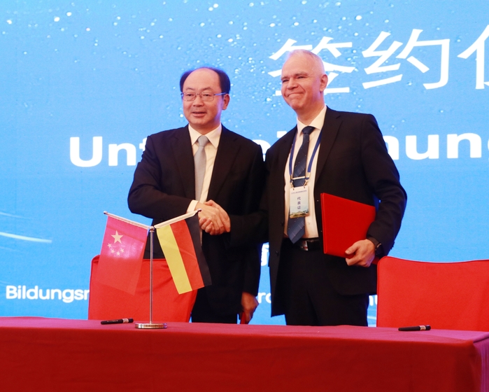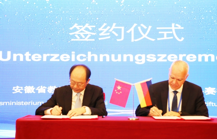 大会举行了签约仪式,钱桂仑和乔治·施泰德作为双方代表签订了合作协议。未来双方将围绕“教学方案研讨”、“提升教师教学以及实践能力”、“引入以实践为导向教学理念”为主题的师资培训,建立建设能力培训中心,建立教学质量管理体系等方面开展合作,进一步增进中德两国在教育领域的交流与友谊,促进安徽省职业教育发展。