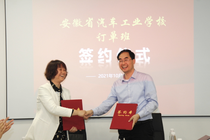 下午1点半,一行人乘车来到安徽风之星投资控股有限责任公司下属的合肥宝利盛汽车销售服务有限公司。首先,风之星集团人力资源总监葛学亮陪同大家参观了店面,体验了产品和服务。在展厅、维修车间、品牌文化区与工作人员就汽车销售、汽车美容维修等方面与工作人员进行了交流,看望了在店内实习的职业院校学生,了解了毕业生在该公司的工作、生活情况。随后,在公司会议室,安徽风之星公司人才发展经理陈晨等人介绍了公司的发展情况,重点从实习实训基地建设、专业和课程建设、课题研究和团队建设等方面汇报了校企合作情况。参会人员就人才培养和产业发展进行了交流。最后,在大家的见证下,风之星公司与安徽职业技术学院汽车工程学院举行了现代学徒制合作签约仪式,与安徽省汽车工业学校举行了人才培养订单班签约仪式。