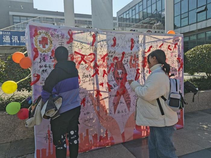 设宣传展板,开展防艾签名活动。在学校主要通道设置宣传台,开展展板签名活动,分发预防艾滋病核心知识的宣传折页。预防艾滋,你我同行,签下的不仅仅是名字,更是一份承诺。通过举办签字活动激发了学生预防艾滋病的使命感和责任感。在学生宿舍区、食堂门口等人流量大的地方,共计悬挂横幅4条、张贴宣传海报30余张、分发宣传折页1000余张。