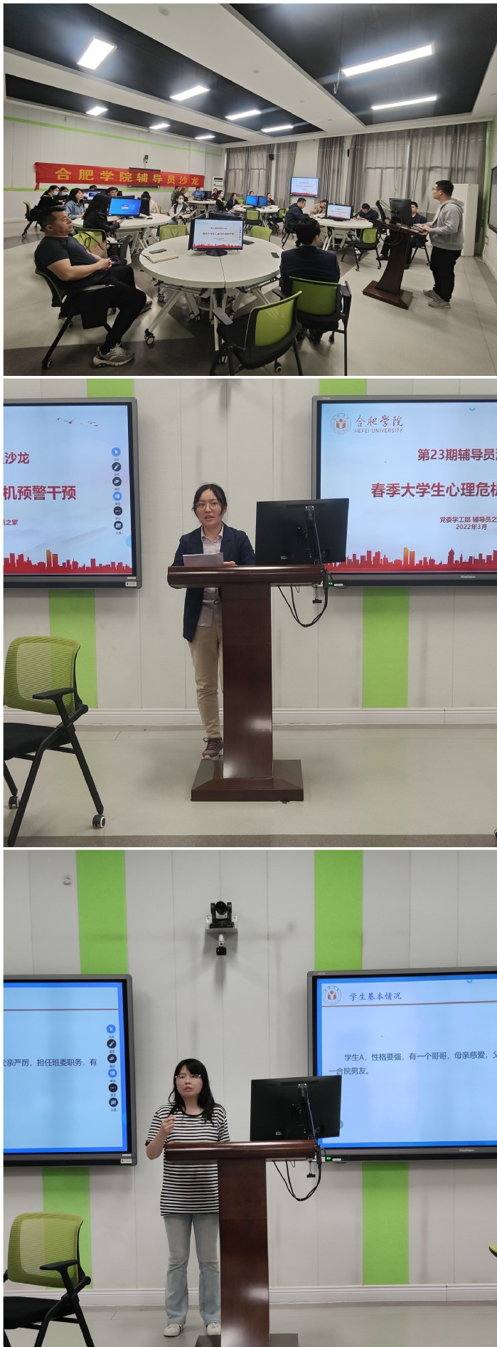设计学院辅导员徐冬、能源材料与化工学院辅导员唐静、语言文化与传媒学院辅导员顾盼盼先后做主题发言。三位辅导员就各自经历的学生心理危机事件的发端起源、早期介入、过程处理、经验做法、学生后续动态等事项进行分享交流。学工部心理健康教育与咨询中心副主任谢琛从三位辅导员的分享入手,结合春季学期学生心理特点、开学以来预约咨询情况等,重点就《合肥学院大学生心理危机预警干预工作指导手册》等做了讲解与说明,并与各位辅导员进行现场交流。