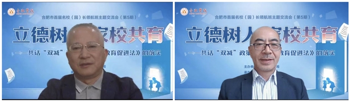 下午,合肥七中党委书记、校长邓宗国,合肥市第四十五中学教育集团党委书记、校长姚剑,合肥市六安路小学教育集团党总支副书记、校长朱清萍分别以“疫情防控背景下学生的安全问题与策略”、“双减背景下如何有效开展家校共育”、“落实‘双减’政策回归教育本真”为主题进行了交流发言。