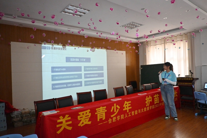 讲座上,实践队员通过精心制作的PPT、生动有趣的校园情景剧,从防溺水、预防校园欺凌、远离网瘾、防电信网络诈骗以及注意人身财产饮食交通安全等方面依次开讲,并结合大量的数据、实例、图片等,把安全意识种在了在场的每位小朋友心中。同时,团队成员还结合合肥学院的基本情况、校园景色等向小朋友们作了大学的宣传推荐,鼓励大家努力学习,争取考上理想的高等院校。