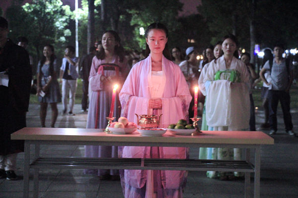 8时许,中秋祭月活动正式开始,10位同学穿着汉服庄重地走向祭拜台,上香、敬酒、叩首,同学们通过中华民族这一古老习俗,表达了我们对家人的思念以及中华传统优秀文化的珍视。