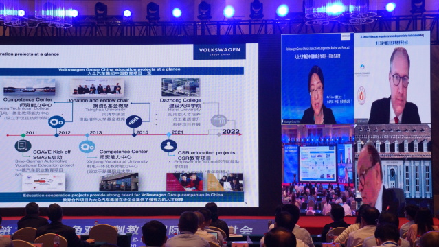 Lou Yi, Seniordirektorin des Volkswagen-Instituts (China) und der Abteilung für Unternehmenskultur und Kommunikation, hielt einen Vortrag mit dem Titel „Überblick und Ausblick der Kooperationsprogramme mit den chinesischen Hochschulen von Volkswagen Group“. Sie gab einen kurzen Überblick über die Bildungskooperationen der Volkswagen Group China, die dualen Bildungsprogramme in der Provinz Anhui und die Entwicklung und Besonderheiten des gemeinsam mit der Universität Hefei errichteten „Volkswagen-Instituts“.