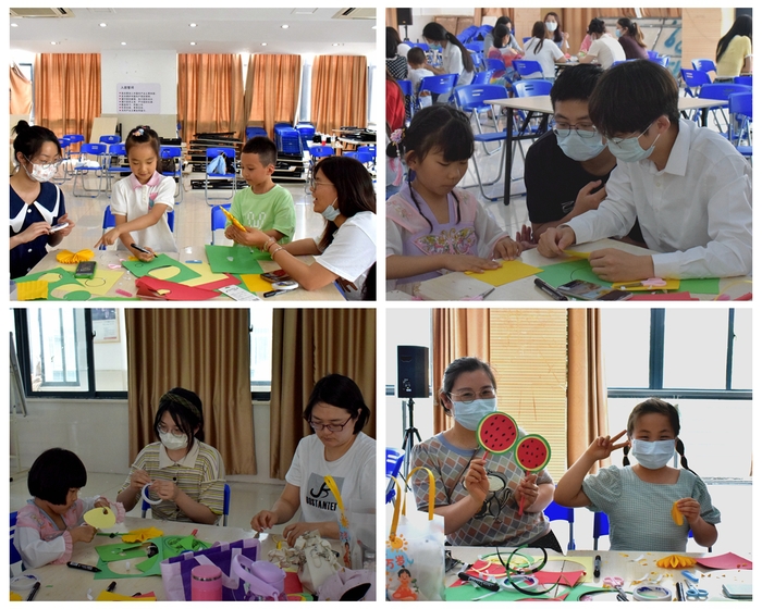 趣味折纸活动中,手工社社团成员对小朋友进行一对一辅导,孩子们认真地学习每一个步骤,一遍遍地重复着手势,妙手翻飞之间,一把把形态各异的纸扇映入眼帘。活动结束后,小朋友们纷纷与自己的手工作品合影留念。