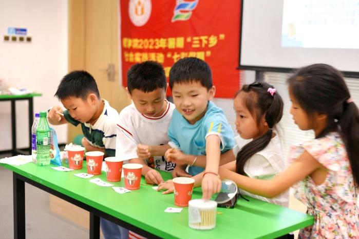 小实验,大启迪。志愿者老师围绕科普主题,带领小朋友们进行pH值测试并介绍pH值的意义以及应用。“大家知道光是怎么传播的吗?”借助视频教学,小朋友们与志愿者老师共同合作,用简易的纸杯与保鲜膜来制作纸杯投影仪,一个个生动可爱的图像在光的照射下展现出来。通过参与科学实验,探究实验原理,在动手的过程中体验科学的奥秘与乐趣,营造了崇尚科学、推动创新的良好氛围。