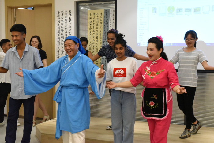 在社区工作人员的带领下,留学生代表参观了临湖社区海外人员服务站,走进多个具有中国文化特色的活动室,中国传统文化特别是传统节日民俗有了更深的感悟。通过体验黄梅戏课程,留学生们了解了黄梅戏起源发展以及流派门类,并现场学习了经典曲目天仙配