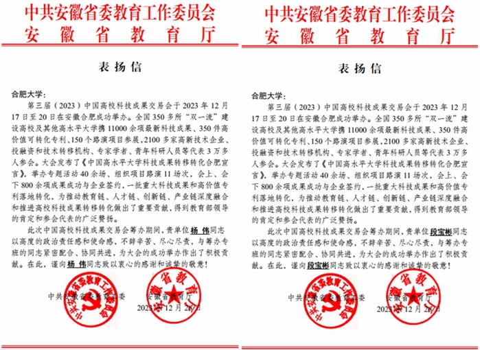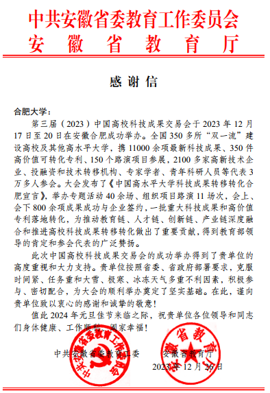 近日,我校收到中共安徽省委教育工作委员会和安徽省教育厅发来的感谢信,对学校在第三届(2023)中国高校科技成果交易会筹备工作的贡献致以衷心的感谢和诚挚的敬意。
