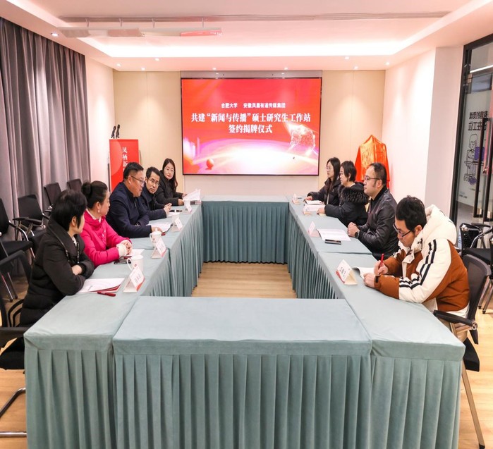 2月2日上午,学校与安徽凤凰有道传媒集团共建的“新闻与传播”硕士研究生工作站在凤栖新媒体产业基地正式揭牌。校党委委员、宣传统战部部长贾峰,语言文化与传媒学院院长丁增武、副院长查金萍、教授张体云、硕士点负责人郭静,安徽凤凰有道传媒集团董事长吴昊、总编室主任王腾飞、综合办主任左雪、人事负责人马燕燕等参加签约揭牌仪式。