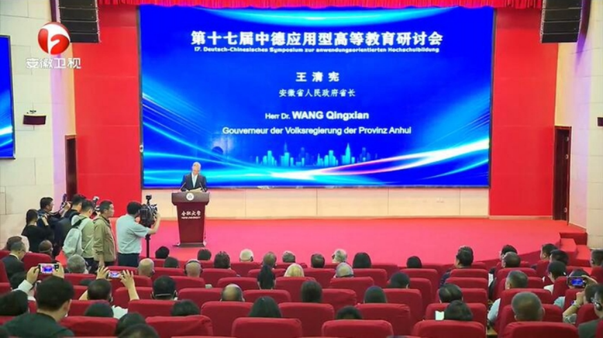 5月29日下午,第十七届中德应用型高等教育研讨会在我校开幕。安徽省委副书记、省长王清宪,德国下萨克森州州长施特凡·魏尔分别致辞。安徽省副省长任清华主持开幕式。德国下萨克森州议会议长汉娜·纳贝尔,德国驻沪总领事贺德满,安徽省副省长孙勇,省政府秘书长潘朝晖,中国人民外交学会欧洲部主任卢金涛,省政府副秘书长汪春明、张红君,省委教育工委书记、教育厅厅长钱桂仑,省外办主任秦俊峰,省教育厅一级巡视员解平,合肥市政府副市长李命山出席开幕式。