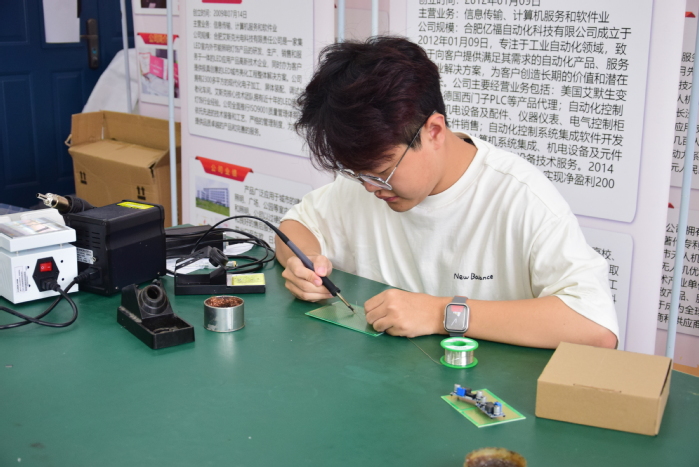 在38栋506创新实验室,2022级电子信息工程专业学生孙晓伟正全力备战两大赛事:全国大学生电子设计竞赛(安徽赛区)及中国国际大学生创新大赛省赛。在钟伦锁老师的悉心指导下,他与团队其他14人一同打磨名为“池鸣天下——新能源电池综合服务平台”的项目,目前,该项目已荣获校赛金奖,省赛计划书也已顺利提交。此外,在电设竞赛上,他与两位队友在李翠花老师的指导下并肩作战,自7月5日起,由李老师带领进行三周密集培训,旨在提升竞赛实力。作为双赛领队,孙晓伟深感责任重大,他自我鞭策:“我将全身心投入培训,不断精进,直至赛事圆满落幕。”
