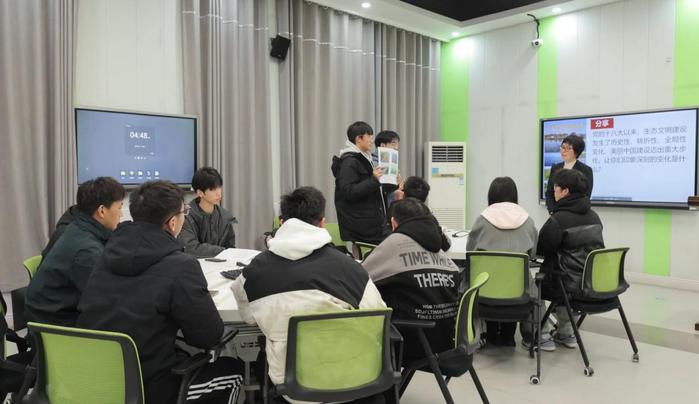 面对百科全书式的知识体系和超百人的大班教学环境,胡彩林从2022年课程一开始就探索实施线上线下混合式教学,通过雨课堂等智慧教学手段进行课前问卷调查、课中讨论互动、课后拓展思考,让学生“忙起来”,实现“线上线下混合”“课内课外联动”有机融合,用数字化技术激活思政课新生态。一方面,通过构建师生线上线下混合式学习共同体,转变静态灌输式学习模式,创建动态引导式学习体系,引导活跃度不高、参与感不强的学生积极参与课堂。另一方面,课内理论讲授与课堂研讨式教学、课外实践教学三者并重,学生由被动听讲变主动输出。