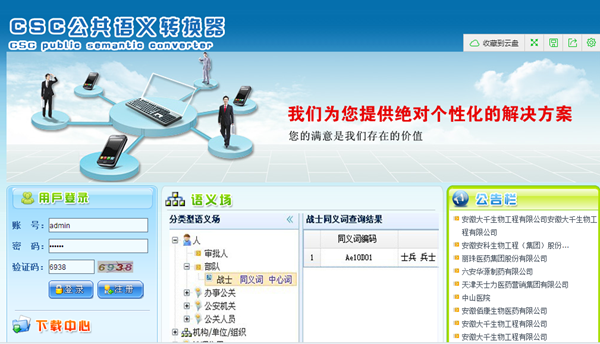 一个部署在公共网络空间的跨领域的、独立运行的软件系统,将过去“一对一”的模式变成“多对多”的模式,无需事先人工协商数据项语义,也无需开发共享服务程序,一个可以直接进行数据交换的平台——CSC公共语义转换器。