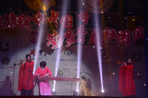 聚光灯重新转回舞台中央,只见两名红衣女子持竹笛缓缓走出,伴着优雅的古筝音,一曲《雨碎江南》将观众带入了另一个古香古色的世界。闭幕式最后一个板块“文化根艺术魂 礼敬中国梦”也就此开始。节奏感十足、技艺高超的B-BOX表演用嘴巴发出十余种不同乐器的声音,婉转华美的戏曲表演《天女散花》,灵动耐听的中英日韩四国歌曲串烧引得全场欢呼不断、掌声连连。由汉宣社带来的舞蹈情景剧表演《洛神赋》,圣洁飘逸的舞姿加之耐人寻味的剧情,让观众们感受到了不一样的历史之风,也为此次晚会画上了一个圆满的句号。