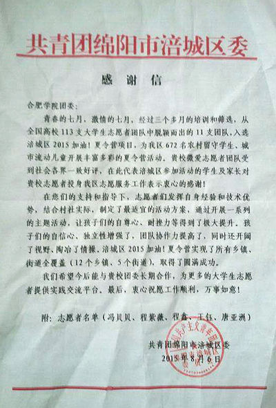 今年,来自全国113支高校志愿者团队报名参加本次2015加油乡村夏令营活动,合肥学院“微爱”团队以全国第二的名次获得项目执行资格,并在七月初奔赴四川绵阳参加社会志愿活动,参加了西南科技大学的五天成长营培训和在绵阳丰谷镇致富村、廻龙沟的两期夏令营营会。据悉,共青团绵阳市涪城区委在给合肥学院团委的感谢信中写道:贵校微爱志愿者团队受到社会各界一致好评,希望今后能与贵校团委长期合作,为更多的大学生志愿者提供实践交流平台。