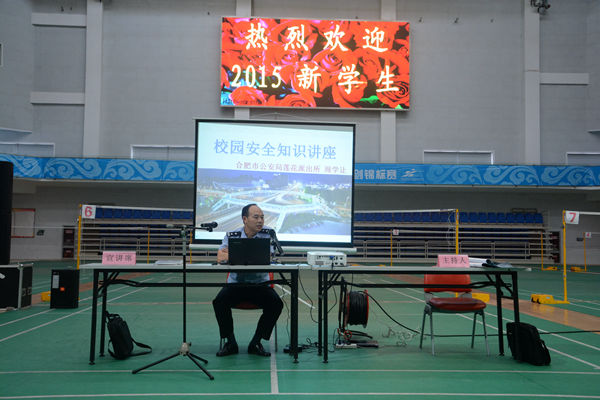 今年我校新生安全教育就专门邀请经开区锦绣派出所、莲花派出所,合肥市电梯行业协会的专家就防火、防盗、防诈骗及电梯使用安全等内容开展安全教育,新生安全法制教育向着专业化、专家化的方向迈进。专题培训在校体育馆举行,全校4500余名新生分批次参加培训,培训会由学生处副处长纪平主持。