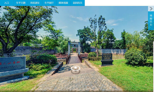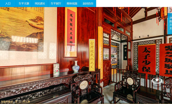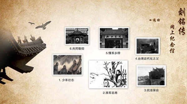 网上纪念馆首页分为新闻动态、故居漫游、资料馆三部分。其中,故居漫游采用了全景式三维立体动态浏览技术,通过虚拟现实技术实现了刘铭传故居风貌的实景再现。随着移动鼠标前进,故居的草地、过道、墙壁似乎都触手可及,有身临其境、漫步其中的感觉;资料馆中更保存了诸多珍贵的刘铭传生平资料。