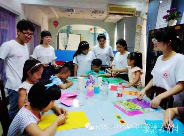 教育系志愿者们前往徽州区黄发幼儿园教育关爱服务团暑期“三下乡”活动,他们与黄发幼儿园中的留守儿童开展了“大手拉小手”结对子活动,开展“农村学前教育现状”的主题调研。为了与他们建立长期联系,大学生志愿者们通过与园中老师交流、建立记录册、与孩子祖父母或亲戚书面交流等形式,掌握了每一位留守儿童的基本情况。据悉,志愿者们将运用所学的专业知识,继续关注、帮助这些孩子们,与他们长期联系,同时教育系也将与黄发幼儿园建立长期合作机制。中国语言文学系志愿者服务队开展了“直击留守儿童”的走访调研,通过对支教孩子的家庭背景、教育环境、成长轨迹、思想发展、现实困难等方面的走访和分析,掌握了目前留守儿童的生活现状和心理问题,呼吁各方共同努力,倾注关爱,营造良好的社会环境,为农村留守儿童创造安全健康的成长环境。外国语言系志愿者服务队在海恒社区精心打造的“自主选课”“小语种教学”“志愿者专业辅导”等创新服务模式得到社区家长们的一致追捧,形式新颖、内容丰富,受到社会广泛关注,合肥日报、江淮晨报、人民网、新华网、凤凰网等多家新闻媒体进行了宣传报道。管理系志愿者们结合活动主题,在海恒社区福禄园社区为社区儿童放映红色电影,教他们折叠红色五角星并佩戴在上衣上,教小朋友学唱《红星歌》。经济系志愿者们开展慰问当地留守儿童志愿服务活动,向他们送去温暖。计算机科学与技术系在长丰县锦湖社开展“情系留守”活动。社团联合会团队在肥西铭传乡开展“爱心支教,梦想起航”活动。化学与材料工程系在泗县陡张村举办“青禾滴露”小课堂支教活动,用一点一滴的关爱去温暖留守儿童幼小的心灵。