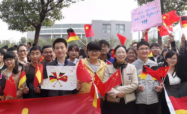 10点40分,王晓艳还清楚地记得,那时总理走出大厅,在热烈的欢呼声中径直走向他们。远远地,总理就先伸出了手,虽然王晓艳非常紧张,但她还是第一个上前握住了总理的手。“当真正握到总理的手时,所有的紧张都消失了,总理的手真的很细腻、很温暖,就像亲人一样。” 王晓艳激动地说到。“总理,欢迎您回家!”这句话没有经过任何思考,却是对总理最发自肺腑的告白。在采访中,王晓艳还向记者说出了她的三点感受——激动、感动、触动。她认为,两国总理的共同到访,是对我校近年来一系列改革以及中德合作项目最大的认可,她期望最终我校学子能够学业有成,学校和中德合作项目也能够有更好的发展。