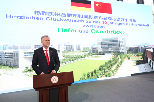 在欢迎仪式上,蔡敬民首先发表了热情洋溢的致辞。他回顾了我校与德国高校合作交流的概况、促使合肥市与德国奥斯纳布吕克市结为友好城市的历史,并介绍合肥学院在建的“中德教育合作示范基地”及配套平台的建设情况,希望合肥学院能在两市经贸发展中发挥更大的作用。