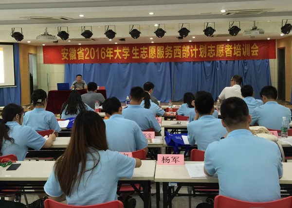 在出征仪式前,7月20日、21日两天在我校大学生活动中心举办了安徽省2016年大学生志愿服务西部计划志愿者培训会。团省委宣传部部长刘存磊、学校部副部长徐波等分别为参加省内西部计划33名志愿者举办了八场共青团工作专题讲座。