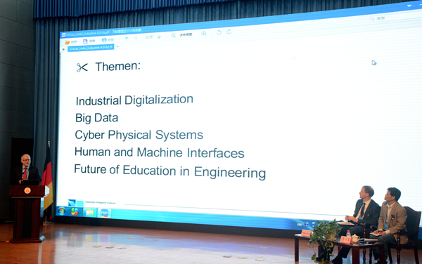 贝尔特拉姆教授和克罗伊茨教授分别以《德国工业4.0:德国应用科学大学的变革与使命》、《应用型大学的教学和科研如何面对工业4.0的挑战》为题作主旨报告。贝尔特拉姆表示,应用型大学的设立能够提高学生、教授跨领域、跨专业的交流与合作能力,有助于加强学生与企业间的联系,促进工业4.0的实现。此外,他还介绍了德国政府为推动教育改革,在应用型大学建设方面实施的的卓越计划、创新高校计划等6大计划。克罗伊茨则回顾了工业1.0到工业4.0的四次变革,介绍了在工业4.0时代,产业化、自主化、控制化、生产网络化的发展过程。他表示,德国工业4.0目前已发展到实施阶段,埃姆登/里尔应用科学大学在课程教学中融入技术、社会等不同因素,建立课题小组,对各学科合作进行探讨,让教学成果深入企业,服务地方经济发展,让产学研紧密结合。