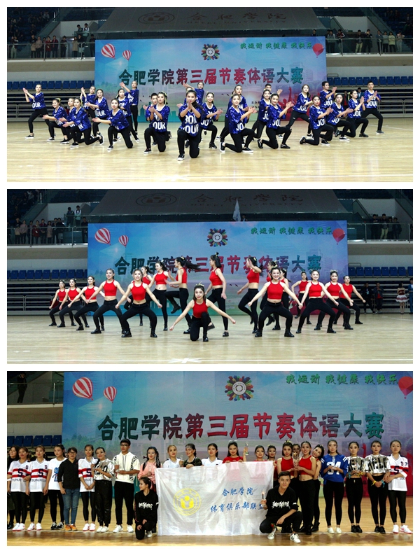 11月14日,由公共体育教学部主办,健美操俱乐部、体育俱乐部联盟承办的合肥学院第三届节奏体语大赛于体育馆隆重举行。公体部主任许大庆,公体部办公室主任霍永海、教学办主任汤攀应邀出席比赛,安徽农业大学岳保柱、安徽艺术学院胡彩红、国家啦啦操一级裁判员何宇菁、体育舞蹈俱乐部负责人吴毕人等担任裁判员。全校13个代表队依次出场,各展身手,朝气蓬勃,为观众献上了一场视听盛宴。教育系夺得本次比赛大队特等奖,经济系和电子信息与电气工程系分别夺得大队和小队一等奖。