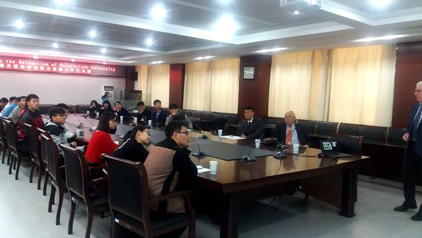 下午,在国际交流合作处协助下,英国斯拉特斯克莱德大学三位教授在厚德大厦学术报告厅与我校有意赴英学生座谈交流,机械工程系、电子信息与电气工程系,以及管理系学生代表参与了此次交流会。会上,三位教授分别就斯特拉斯克莱德大学的教学情况、申请项目、本科与研究生学位制及入学要求等方面展开介绍。最后,三位教授就学生提出的赴英学习、生活等问题进行答疑解惑。座谈会后,三位教授还赴管理系,与管理系师生交流,洽谈具体合作事项。