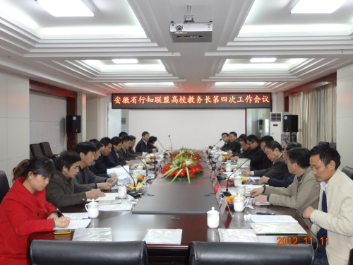 20121111下午,安徽省应用型本科高校联盟教务处处长第四次工作会议在合肥学院行政楼9楼会议室顺利召开。参加会议的有联盟16所高校的教务处处长。合肥学院陈秀副院长、办公室主任刘樟树以及联盟秘书处伍德勤处长、余国江副处长等参加了会议。