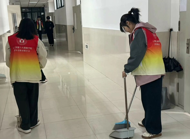 当天傍晚,志愿者们携带卫生工具,进入教学楼进行清扫。经过志愿者的共同努力,教学楼各楼层焕然一新,校园环境更加整洁。