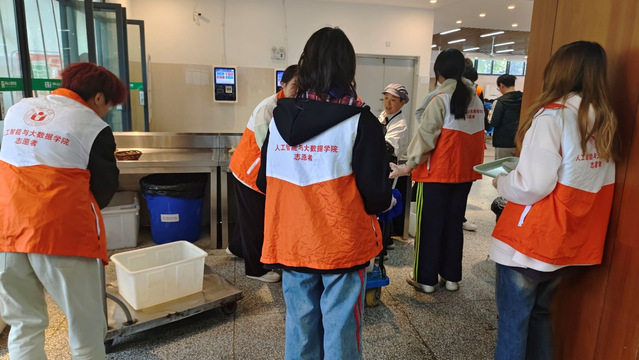 活动当天,人工智能与大数据学院的志愿者们不仅协助食堂工作人员维持秩序、清理餐桌和打扫地面,还帮助食堂阿姨收拾碗筷,让人感受到志愿者的爱心与温暖。