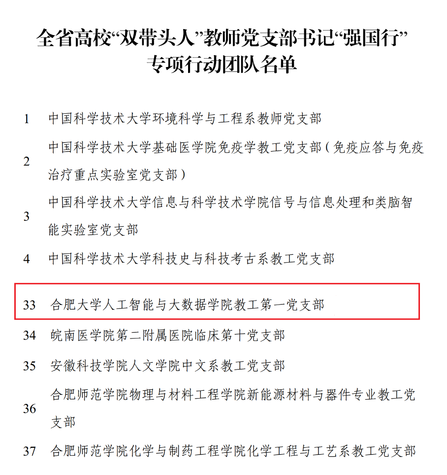 近日,中共安徽省委教育工委公布了全省高校 “双带头人”教师党支部书记“强国行” 专项行动团队名单,人工智能与大数据学院教工第一党支部成功入选。