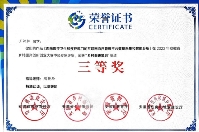对于王汉阳来说,学习从来都不局限于课堂。他曾经参加过“挑战杯”、“互联网+”、大数据与人工智能应用竞赛等大大小小的科研竞赛,其中多次获得了理想的成绩。在安徽省大学生网络与分布式系统创新设计大赛中,他与队友们齐心协力,面对复杂的赛题,他们不畏惧、不退缩。经过连续多日的艰苦奋战,不断尝试各种解决方案,最终成功突破重重难关,荣获大数据应用赛道三等奖。这次经历让他深刻体会到团队协作的无穷力量,也激发了他在竞赛道路上继续前行的斗志。此后,他又勇敢地踏上了安徽省大数据与人工智能应用竞赛的征程。在比赛过程中,他们遭遇了诸多技术难题和时间紧迫的双重压力。然而,王汉阳凭借扎实的专业知识和冷静的头脑,带领团队成员深入分析问题,查阅大量资料,经过反复调试和优化,成功找到了解决方案,在众多参赛队伍中脱颖而出,斩获了大数据赛道二等奖。这些竞赛经历不仅磨砺了他的专业技能,更培养了他坚韧不拔的毅力和创新思维。